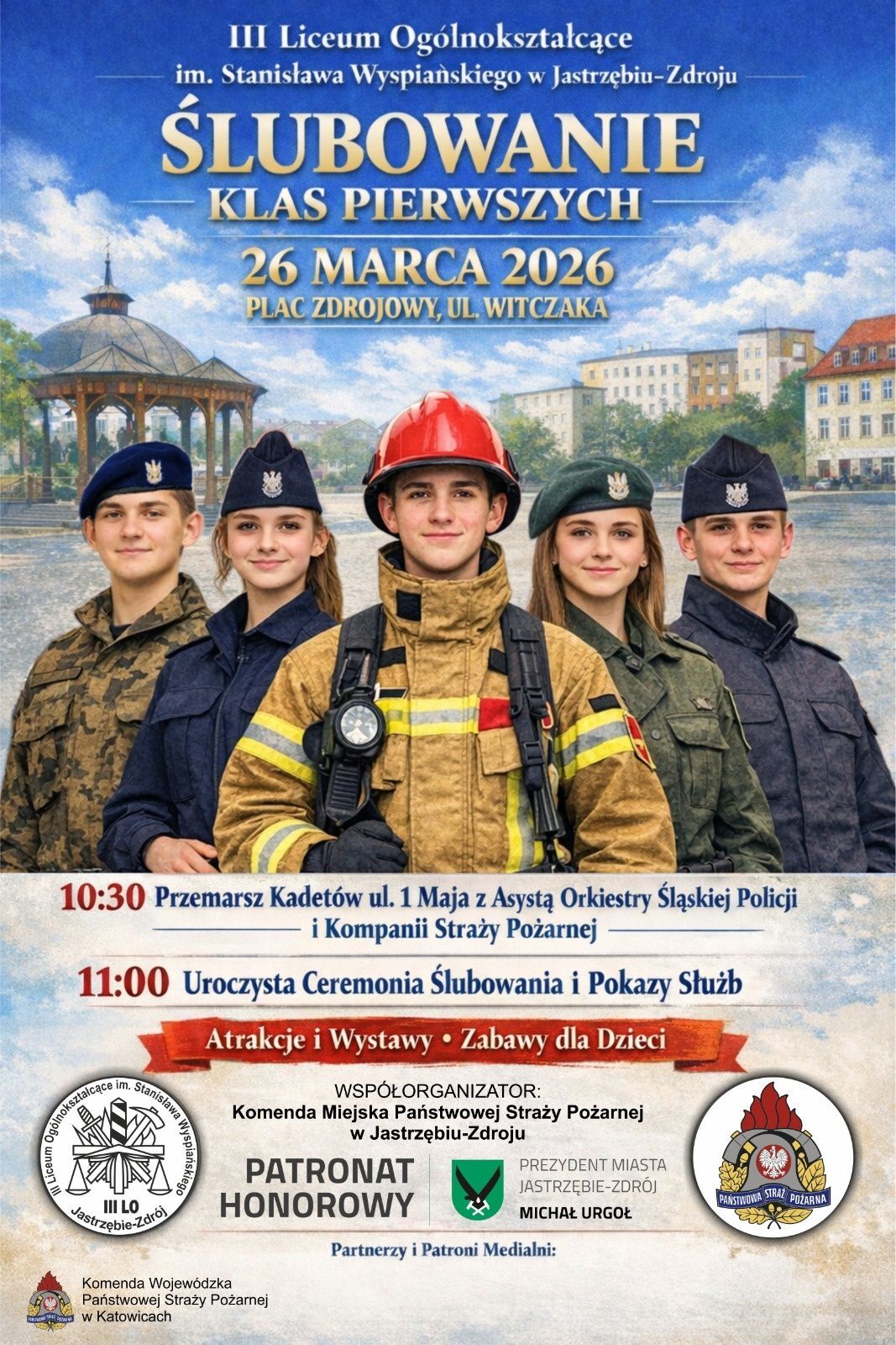 Na zaproszenie Dyrekcji III Liceum Ogólnokształcące, im. S. Wyspiańskiego w Jastrzębiu-Zdroju ,mieliśmy zaszczyt wziąć udział w ślubowaniu klas mundurowych. Deszcz nie był w stanie przyćmić podniosłej atmosfery tego wyjątkowego wydarzenia. Był to moment pełen dumy, wzruszeń i szacunku dla wartości, które reprezentują młodzi adepci służb.